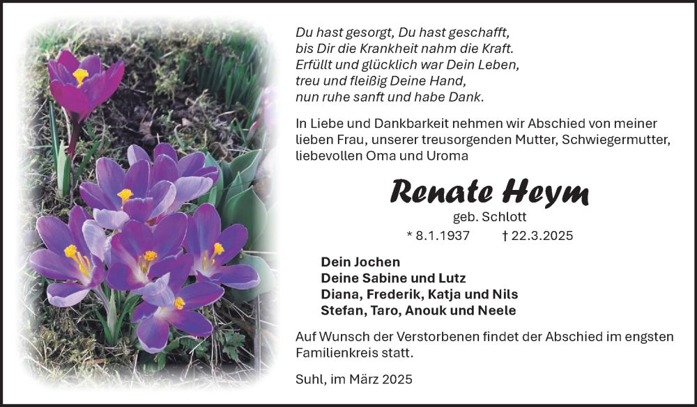 Hier finden Sie alle Traueranzeigen aus der Zeitung, die bisher für Renate Heym erschienen sind. Weitere Traueranzeigen, die in der Zeitung erscheinen, werden hier ebenfalls aufgelistet