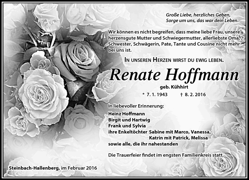 Hier finden Sie alle Traueranzeigen aus der Zeitung, die bisher für Renate Hoffmann erschienen sind. Weitere Traueranzeigen, die in der Zeitung erscheinen, werden hier ebenfalls aufgelistet