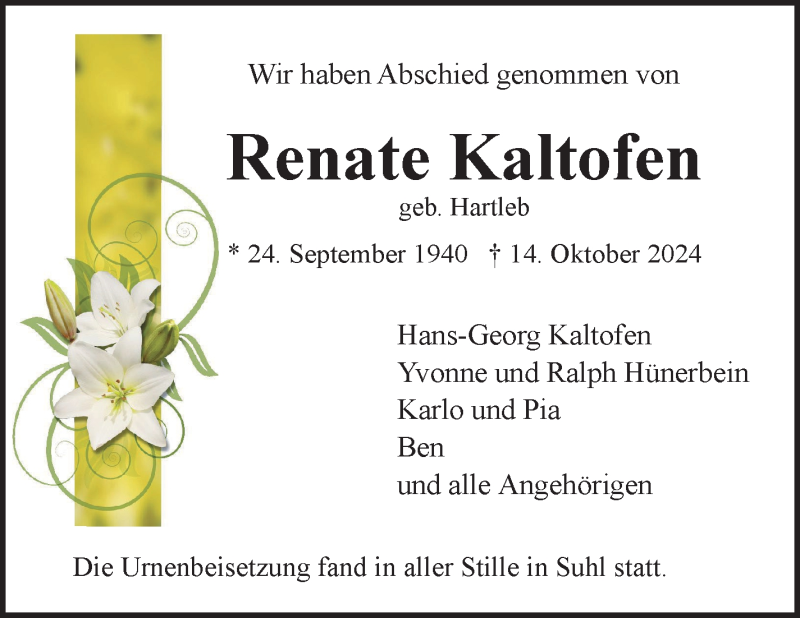 Hier finden Sie alle Traueranzeigen aus der Zeitung, die bisher für Renate Kaltofen erschienen sind. Weitere Traueranzeigen, die in der Zeitung erscheinen, werden hier ebenfalls aufgelistet