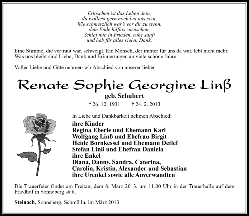 Hier finden Sie alle Traueranzeigen aus der Zeitung, die bisher für Renate Linß erschienen sind. Weitere Traueranzeigen, die in der Zeitung erscheinen, werden hier ebenfalls aufgelistet