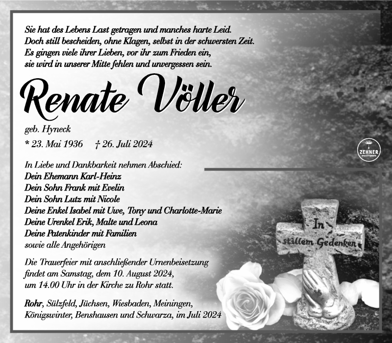 Hier finden Sie alle Traueranzeigen aus der Zeitung, die bisher für Renate Völler erschienen sind. Weitere Traueranzeigen, die in der Zeitung erscheinen, werden hier ebenfalls aufgelistet