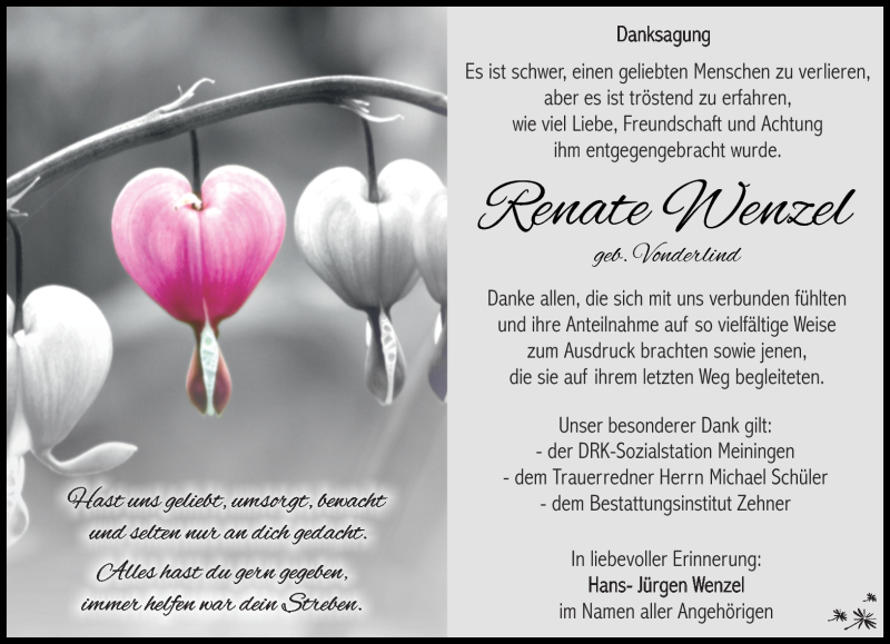 Hier finden Sie alle Traueranzeigen aus der Zeitung, die bisher für Renate Wenzel erschienen sind. Weitere Traueranzeigen, die in der Zeitung erscheinen, werden hier ebenfalls aufgelistet