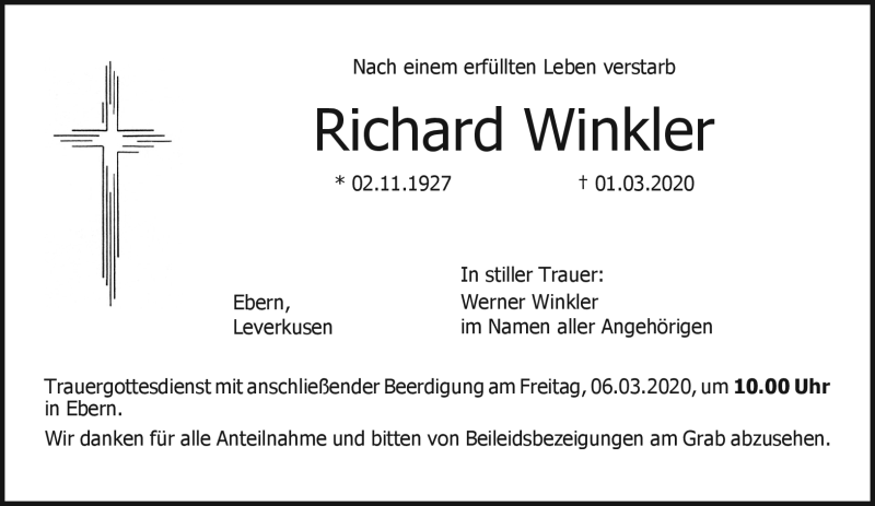 Hier finden Sie alle Traueranzeigen aus der Zeitung, die bisher für Richard Winkler erschienen sind. Weitere Traueranzeigen, die in der Zeitung erscheinen, werden hier ebenfalls aufgelistet