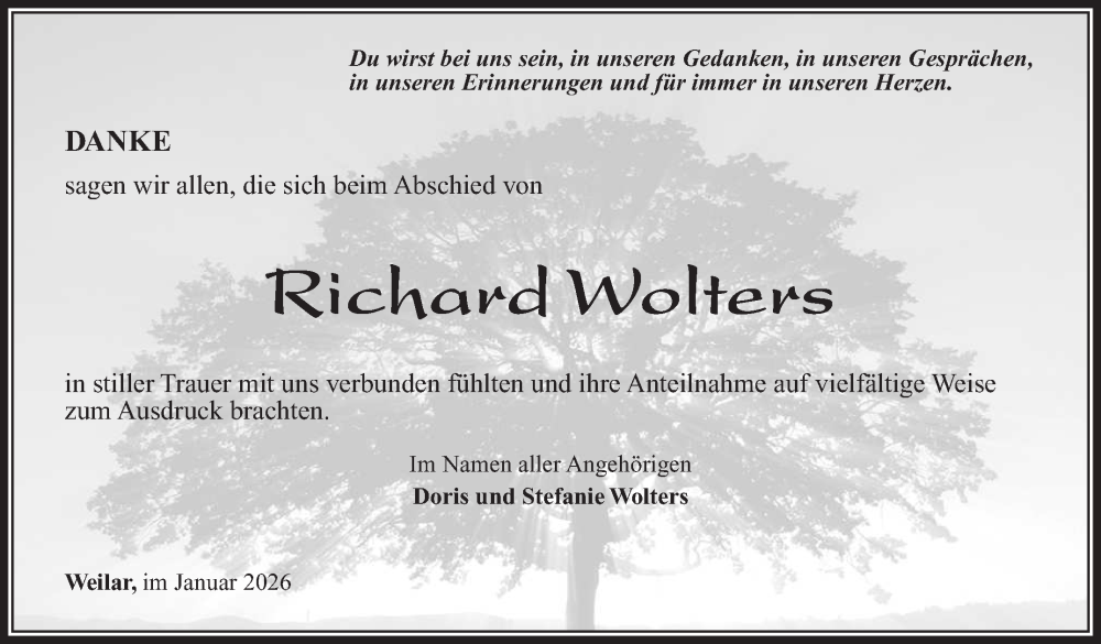 Hier finden Sie alle Traueranzeigen aus der Zeitung, die bisher für Richard Wolters erschienen sind. Weitere Traueranzeigen, die in der Zeitung erscheinen, werden hier ebenfalls aufgelistet