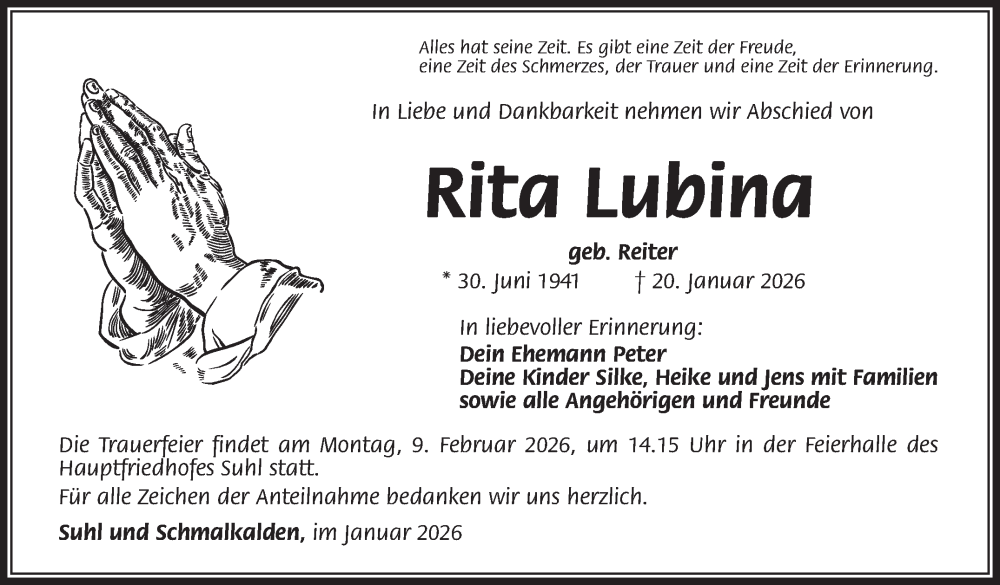Hier finden Sie alle Traueranzeigen aus der Zeitung, die bisher für Rita Lubina erschienen sind. Weitere Traueranzeigen, die in der Zeitung erscheinen, werden hier ebenfalls aufgelistet