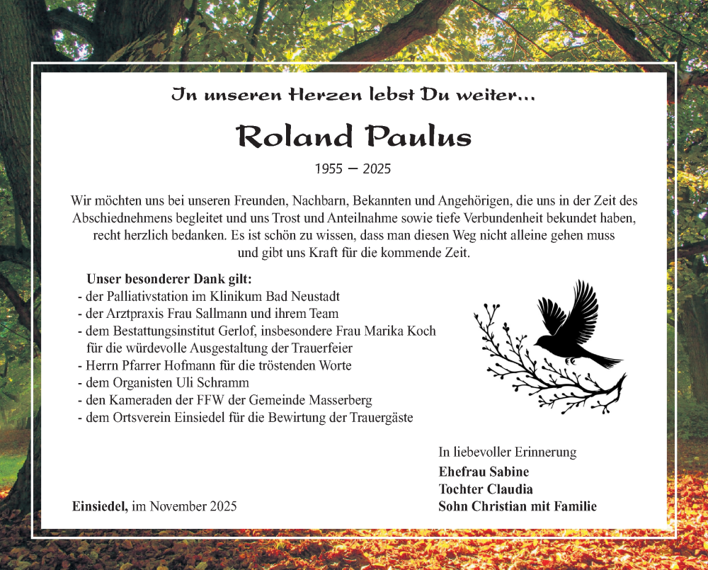 Hier finden Sie alle Traueranzeigen aus der Zeitung, die bisher für Roland Paulus erschienen sind. Weitere Traueranzeigen, die in der Zeitung erscheinen, werden hier ebenfalls aufgelistet