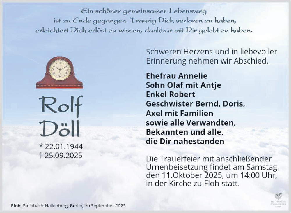 Hier finden Sie alle Traueranzeigen aus der Zeitung, die bisher für Rolf Döll erschienen sind. Weitere Traueranzeigen, die in der Zeitung erscheinen, werden hier ebenfalls aufgelistet