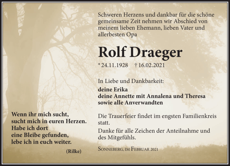 Hier finden Sie alle Traueranzeigen aus der Zeitung, die bisher für Rolf Draeger erschienen sind. Weitere Traueranzeigen, die in der Zeitung erscheinen, werden hier ebenfalls aufgelistet