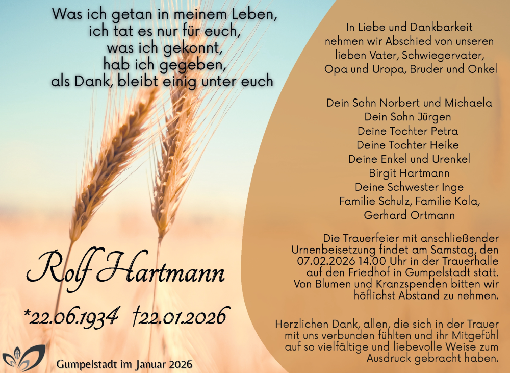 Hier finden Sie alle Traueranzeigen aus der Zeitung, die bisher für Rolf Hartmann erschienen sind. Weitere Traueranzeigen, die in der Zeitung erscheinen, werden hier ebenfalls aufgelistet
