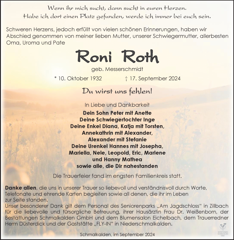 Hier finden Sie alle Traueranzeigen aus der Zeitung, die bisher für Roni Roth erschienen sind. Weitere Traueranzeigen, die in der Zeitung erscheinen, werden hier ebenfalls aufgelistet