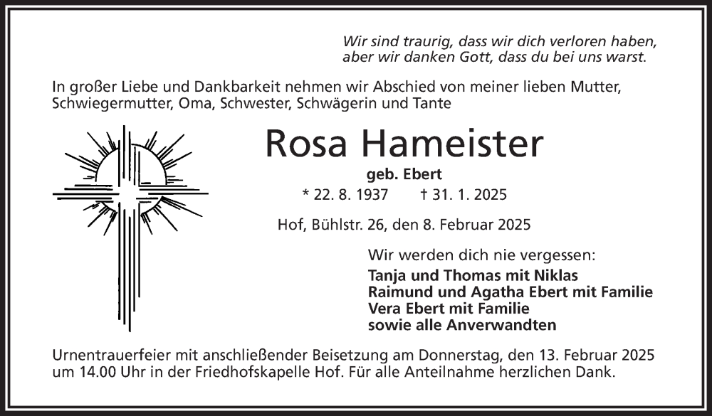 Hier finden Sie alle Traueranzeigen aus der Zeitung, die bisher für Rosa Hameister erschienen sind. Weitere Traueranzeigen, die in der Zeitung erscheinen, werden hier ebenfalls aufgelistet