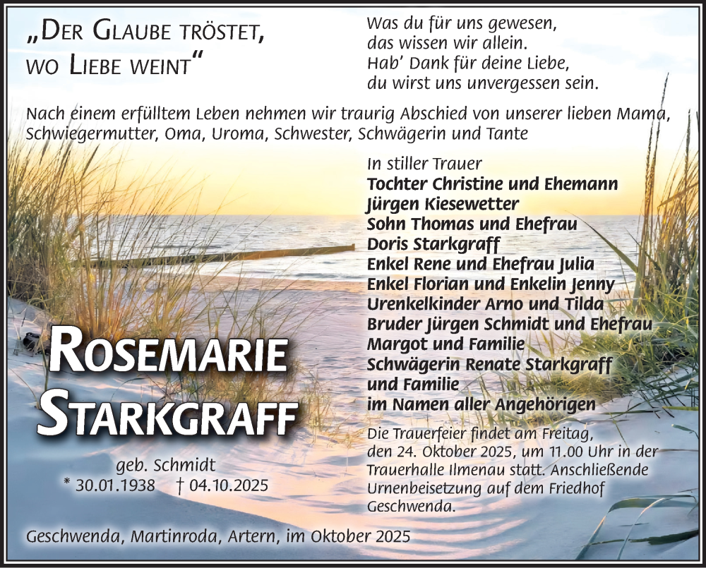 Hier finden Sie alle Traueranzeigen aus der Zeitung, die bisher für Rosemarie Starkgraff erschienen sind. Weitere Traueranzeigen, die in der Zeitung erscheinen, werden hier ebenfalls aufgelistet