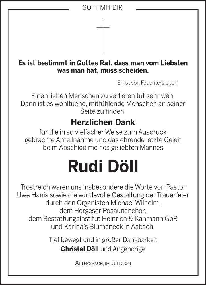 Hier finden Sie alle Traueranzeigen aus der Zeitung, die bisher für Rudi Döll erschienen sind. Weitere Traueranzeigen, die in der Zeitung erscheinen, werden hier ebenfalls aufgelistet