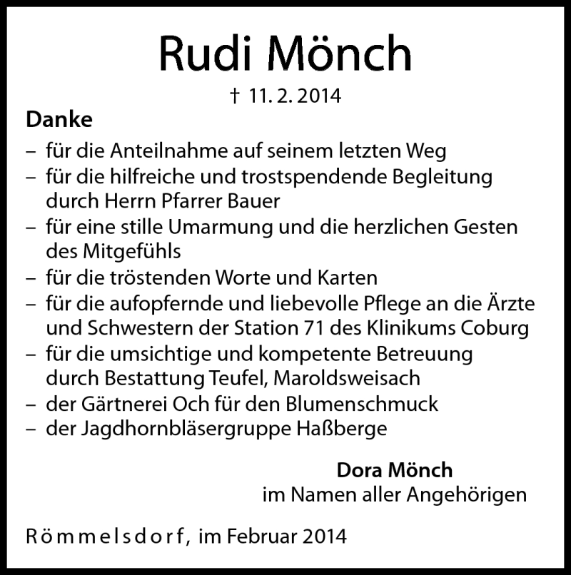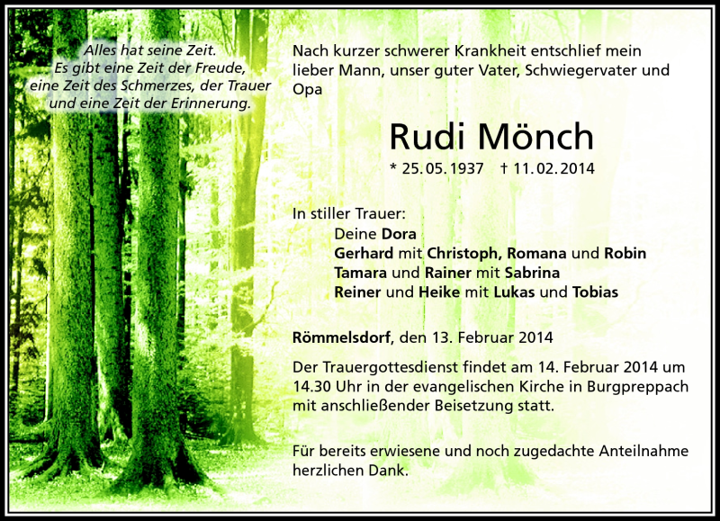 Hier finden Sie alle Traueranzeigen aus der Zeitung, die bisher für Rudi Mönch erschienen sind. Weitere Traueranzeigen, die in der Zeitung erscheinen, werden hier ebenfalls aufgelistet