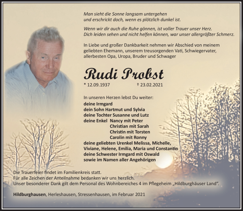 Hier finden Sie alle Traueranzeigen aus der Zeitung, die bisher für Rudi Probst erschienen sind. Weitere Traueranzeigen, die in der Zeitung erscheinen, werden hier ebenfalls aufgelistet