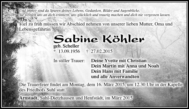 Hier finden Sie alle Traueranzeigen aus der Zeitung, die bisher für Sabine Köhler erschienen sind. Weitere Traueranzeigen, die in der Zeitung erscheinen, werden hier ebenfalls aufgelistet