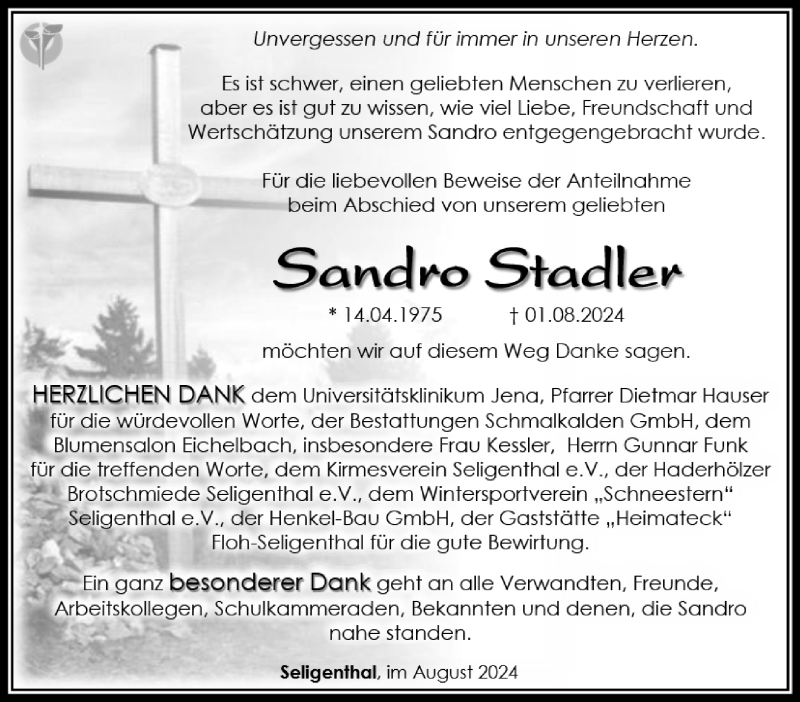 Hier finden Sie alle Traueranzeigen aus der Zeitung, die bisher für Sandro Stadler erschienen sind. Weitere Traueranzeigen, die in der Zeitung erscheinen, werden hier ebenfalls aufgelistet