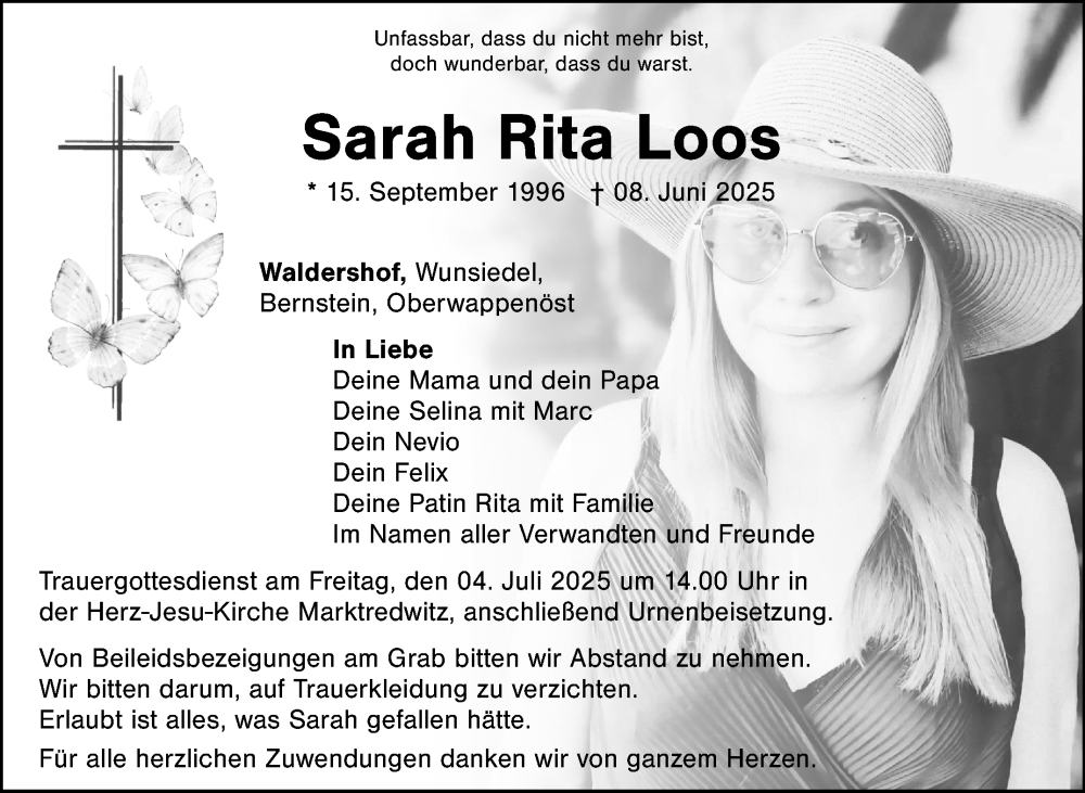 Hier finden Sie alle Traueranzeigen aus der Zeitung, die bisher für Sarah Rita Loos erschienen sind. Weitere Traueranzeigen, die in der Zeitung erscheinen, werden hier ebenfalls aufgelistet