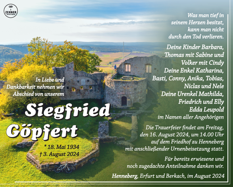 Hier finden Sie alle Traueranzeigen aus der Zeitung, die bisher für Siegfried Göpfert erschienen sind. Weitere Traueranzeigen, die in der Zeitung erscheinen, werden hier ebenfalls aufgelistet