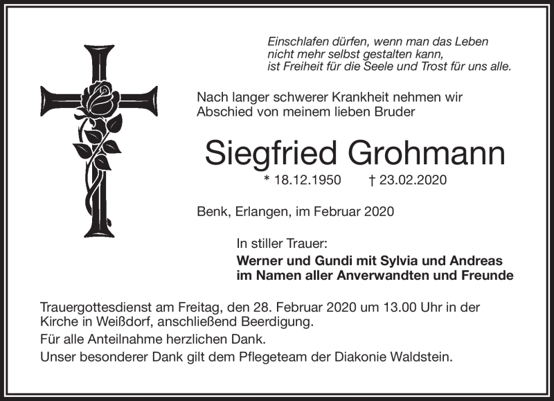 Hier finden Sie alle Traueranzeigen aus der Zeitung, die bisher für Siegfried Grohmann erschienen sind. Weitere Traueranzeigen, die in der Zeitung erscheinen, werden hier ebenfalls aufgelistet