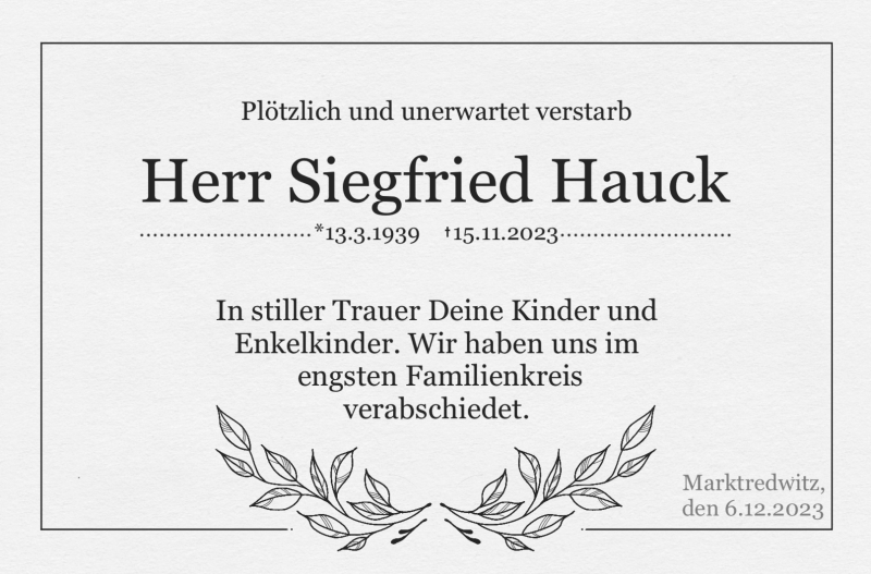 Hier finden Sie alle Traueranzeigen aus der Zeitung, die bisher für Siegfried Hauck erschienen sind. Weitere Traueranzeigen, die in der Zeitung erscheinen, werden hier ebenfalls aufgelistet