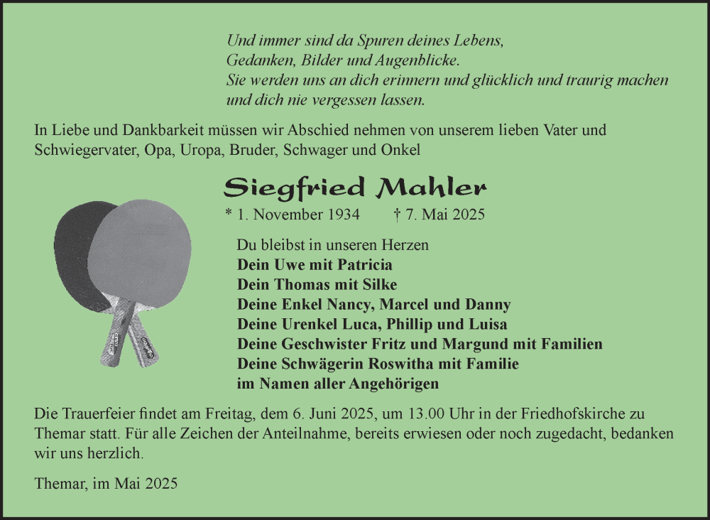 Hier finden Sie alle Traueranzeigen aus der Zeitung, die bisher für Siegfried Mahler erschienen sind. Weitere Traueranzeigen, die in der Zeitung erscheinen, werden hier ebenfalls aufgelistet