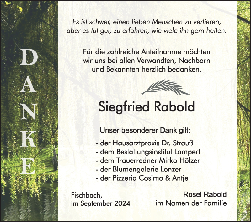 Hier finden Sie alle Traueranzeigen aus der Zeitung, die bisher für Siegfried Rabold erschienen sind. Weitere Traueranzeigen, die in der Zeitung erscheinen, werden hier ebenfalls aufgelistet