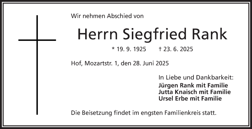 Hier finden Sie alle Traueranzeigen aus der Zeitung, die bisher für Siegfried Rank erschienen sind. Weitere Traueranzeigen, die in der Zeitung erscheinen, werden hier ebenfalls aufgelistet