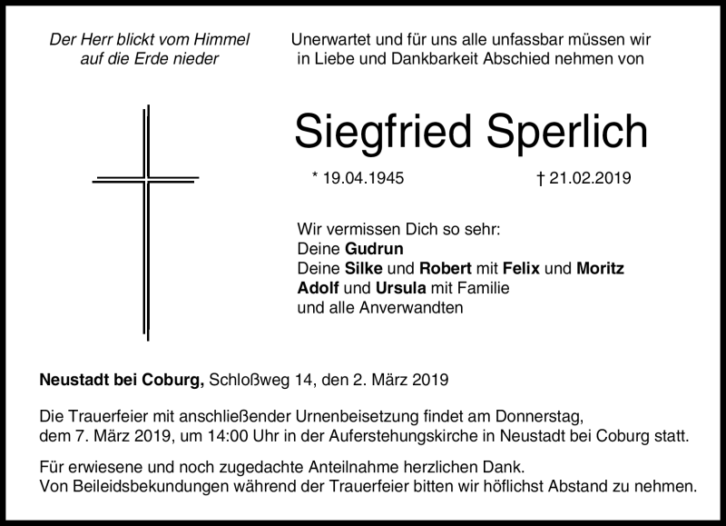 Hier finden Sie alle Traueranzeigen aus der Zeitung, die bisher für Siegfried Sperlich erschienen sind. Weitere Traueranzeigen, die in der Zeitung erscheinen, werden hier ebenfalls aufgelistet
