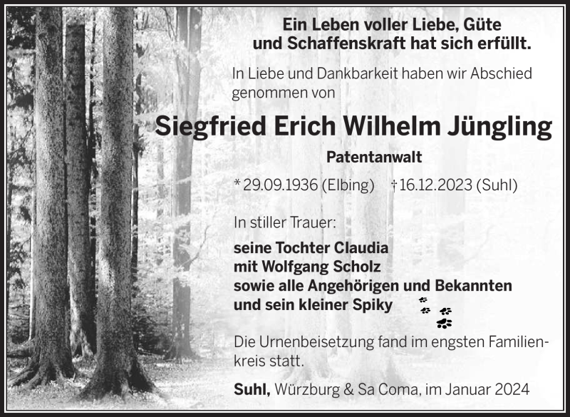 Hier finden Sie alle Traueranzeigen aus der Zeitung, die bisher für Siegfried Erich Wilhelm Jüngling erschienen sind. Weitere Traueranzeigen, die in der Zeitung erscheinen, werden hier ebenfalls aufgelistet
