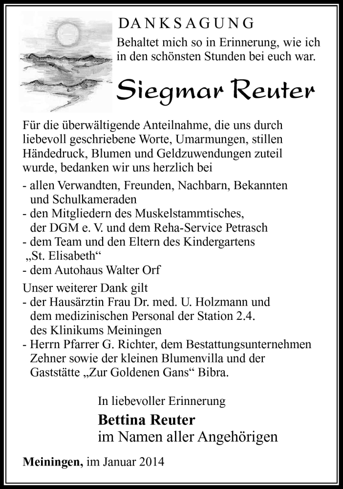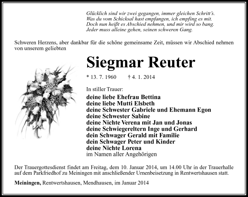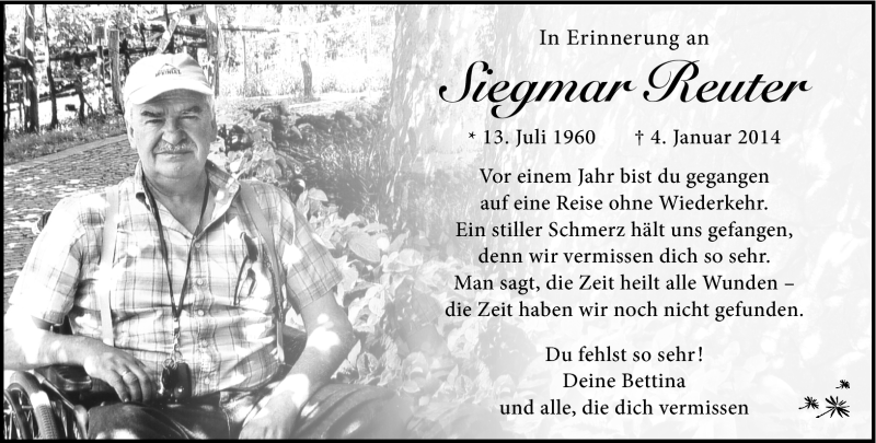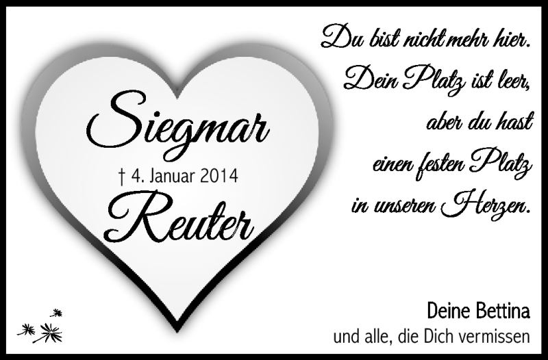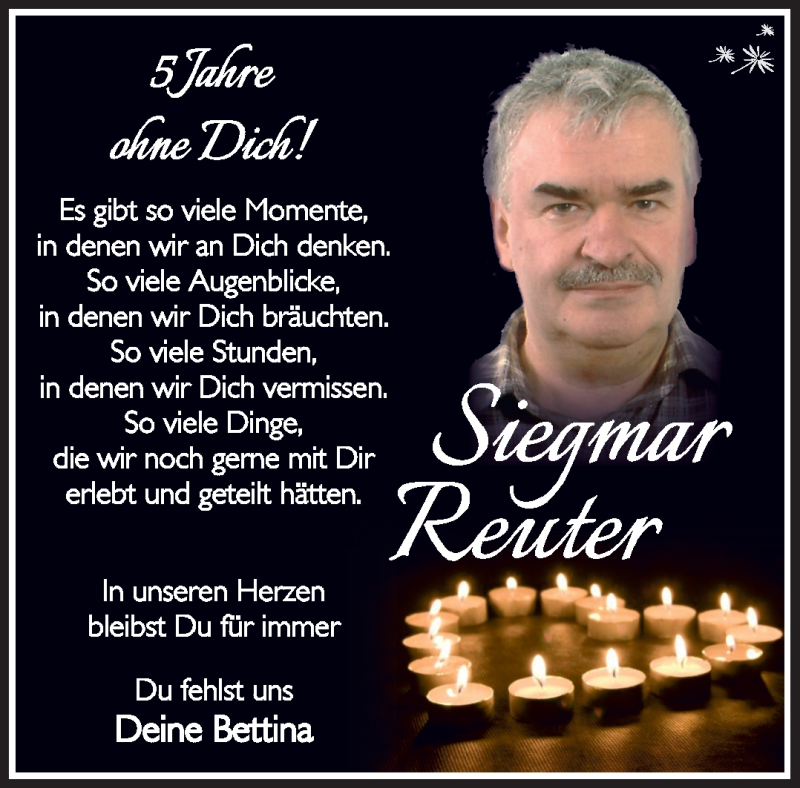 Hier finden Sie alle Traueranzeigen aus der Zeitung, die bisher für Siegmar Reuter erschienen sind. Weitere Traueranzeigen, die in der Zeitung erscheinen, werden hier ebenfalls aufgelistet