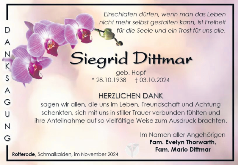 Hier finden Sie alle Traueranzeigen aus der Zeitung, die bisher für Siegrid Dittmar erschienen sind. Weitere Traueranzeigen, die in der Zeitung erscheinen, werden hier ebenfalls aufgelistet