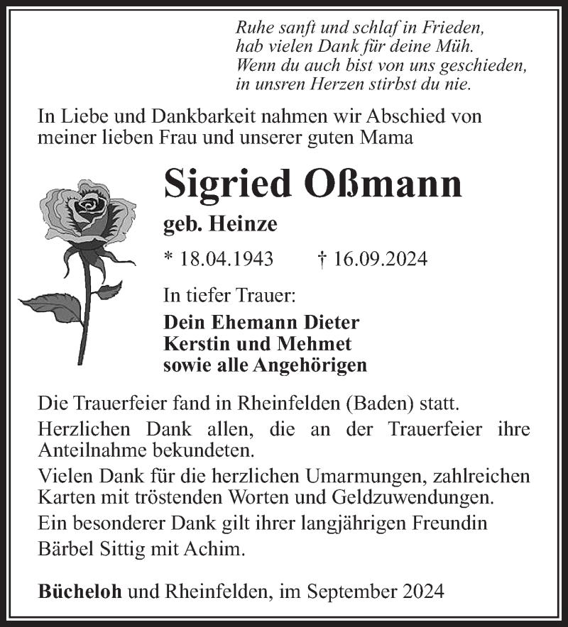 Hier finden Sie alle Traueranzeigen aus der Zeitung, die bisher für Siegrid Oßmann erschienen sind. Weitere Traueranzeigen, die in der Zeitung erscheinen, werden hier ebenfalls aufgelistet