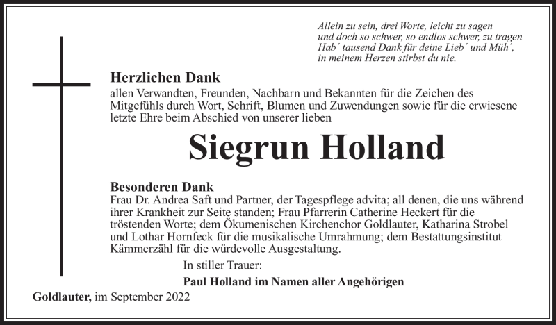 Hier finden Sie alle Traueranzeigen aus der Zeitung, die bisher für Siegrun Holland erschienen sind. Weitere Traueranzeigen, die in der Zeitung erscheinen, werden hier ebenfalls aufgelistet
