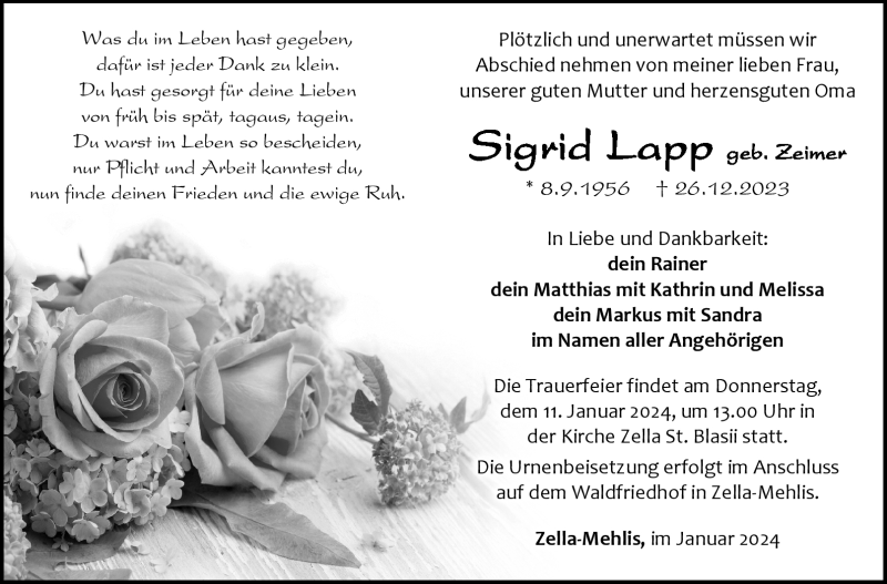 Hier finden Sie alle Traueranzeigen aus der Zeitung, die bisher für Sigrid Lapp erschienen sind. Weitere Traueranzeigen, die in der Zeitung erscheinen, werden hier ebenfalls aufgelistet
