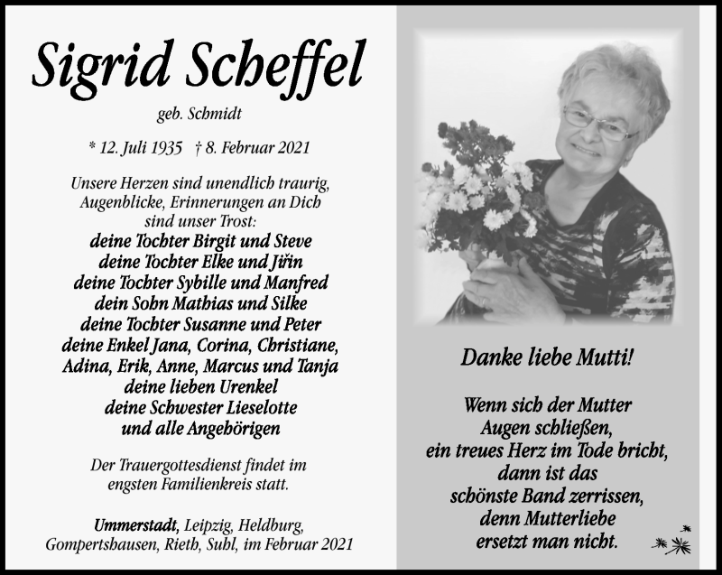 Hier finden Sie alle Traueranzeigen aus der Zeitung, die bisher für Sigrid Scheffel erschienen sind. Weitere Traueranzeigen, die in der Zeitung erscheinen, werden hier ebenfalls aufgelistet
