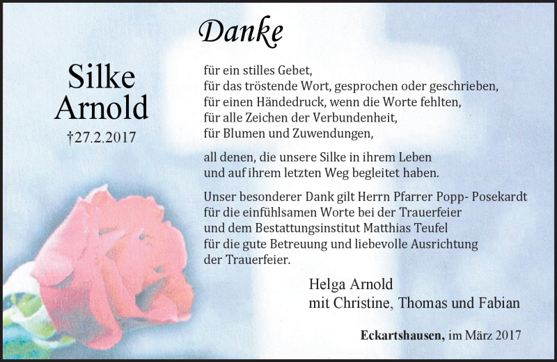 Hier finden Sie alle Traueranzeigen aus der Zeitung, die bisher für Silke Arnold erschienen sind. Weitere Traueranzeigen, die in der Zeitung erscheinen, werden hier ebenfalls aufgelistet