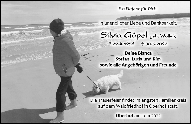 Hier finden Sie alle Traueranzeigen aus der Zeitung, die bisher für Silvia Göpel erschienen sind. Weitere Traueranzeigen, die in der Zeitung erscheinen, werden hier ebenfalls aufgelistet