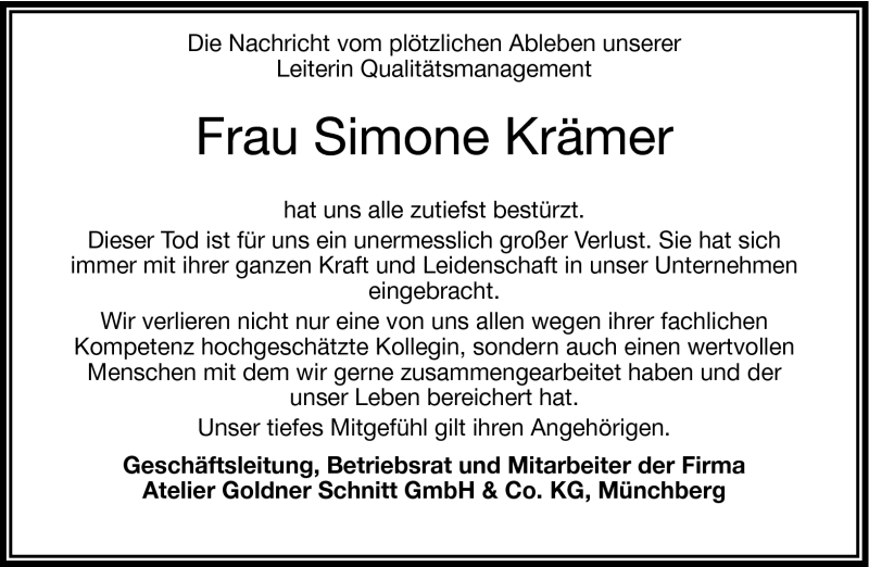 Hier finden Sie alle Traueranzeigen aus der Zeitung, die bisher für Simone Krämer erschienen sind. Weitere Traueranzeigen, die in der Zeitung erscheinen, werden hier ebenfalls aufgelistet