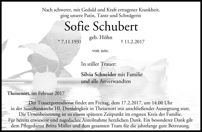 Hier finden Sie alle Traueranzeigen aus der Zeitung, die bisher für Sofie Schubert erschienen sind. Weitere Traueranzeigen, die in der Zeitung erscheinen, werden hier ebenfalls aufgelistet
