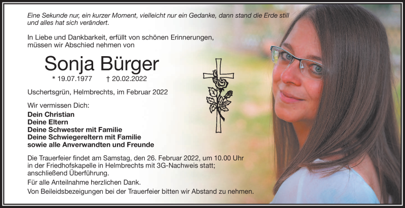 Hier finden Sie alle Traueranzeigen aus der Zeitung, die bisher für Sonja Bürger erschienen sind. Weitere Traueranzeigen, die in der Zeitung erscheinen, werden hier ebenfalls aufgelistet