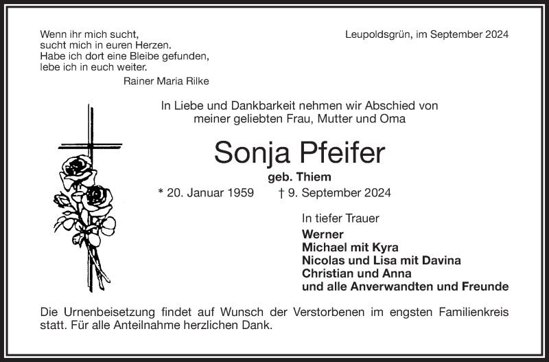 Hier finden Sie alle Traueranzeigen aus der Zeitung, die bisher für Sonja Pfeifer erschienen sind. Weitere Traueranzeigen, die in der Zeitung erscheinen, werden hier ebenfalls aufgelistet