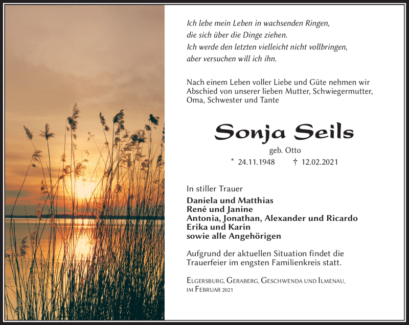 Hier finden Sie alle Traueranzeigen aus der Zeitung, die bisher für Sonja Seils erschienen sind. Weitere Traueranzeigen, die in der Zeitung erscheinen, werden hier ebenfalls aufgelistet