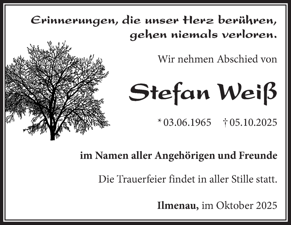 Hier finden Sie alle Traueranzeigen aus der Zeitung, die bisher für Stefan Weiß erschienen sind. Weitere Traueranzeigen, die in der Zeitung erscheinen, werden hier ebenfalls aufgelistet