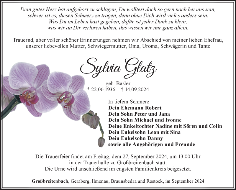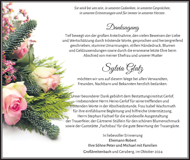 Hier finden Sie alle Traueranzeigen aus der Zeitung, die bisher für Sylvia Glatz erschienen sind. Weitere Traueranzeigen, die in der Zeitung erscheinen, werden hier ebenfalls aufgelistet