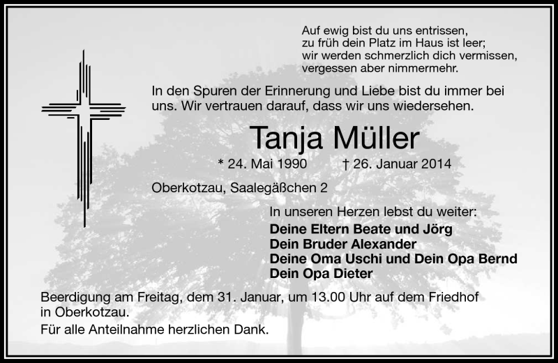 Hier finden Sie alle Traueranzeigen aus der Zeitung, die bisher für Tanja Müller erschienen sind. Weitere Traueranzeigen, die in der Zeitung erscheinen, werden hier ebenfalls aufgelistet