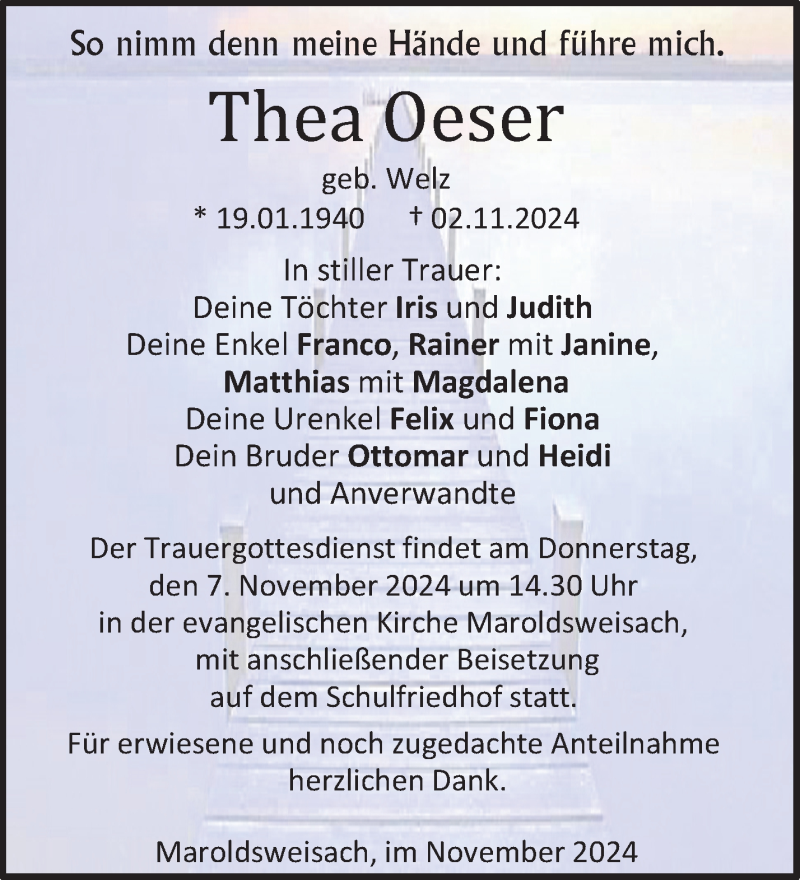 Hier finden Sie alle Traueranzeigen aus der Zeitung, die bisher für Thea Oeser erschienen sind. Weitere Traueranzeigen, die in der Zeitung erscheinen, werden hier ebenfalls aufgelistet
