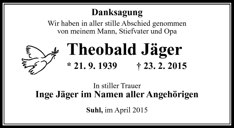 Hier finden Sie alle Traueranzeigen aus der Zeitung, die bisher für Theobald Jäger erschienen sind. Weitere Traueranzeigen, die in der Zeitung erscheinen, werden hier ebenfalls aufgelistet