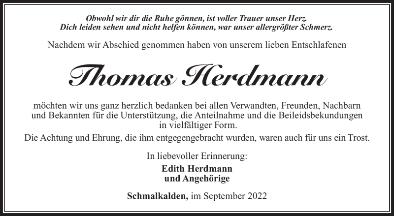 Hier finden Sie alle Traueranzeigen aus der Zeitung, die bisher für Thomas Herdmann erschienen sind. Weitere Traueranzeigen, die in der Zeitung erscheinen, werden hier ebenfalls aufgelistet
