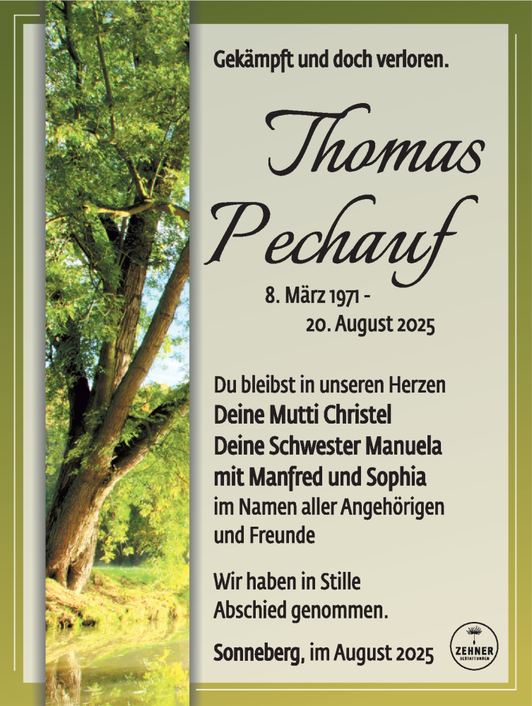 Hier finden Sie alle Traueranzeigen aus der Zeitung, die bisher für Thomas Pechauf erschienen sind. Weitere Traueranzeigen, die in der Zeitung erscheinen, werden hier ebenfalls aufgelistet
